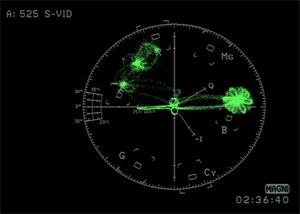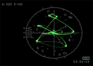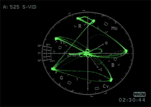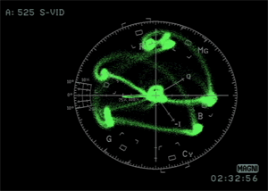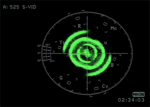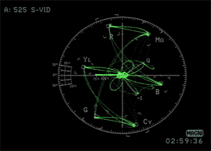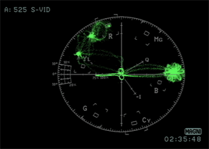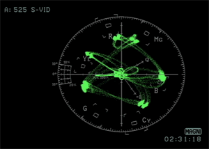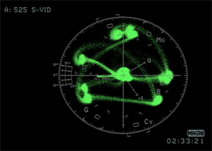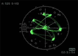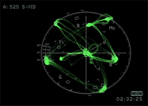 This completely surprised me, since I didn't realize my TV had so much of a problem dealing with oversaturation. I decided to put the Color Bar Generator cart's picture through a vectorscope, to see what was going on.